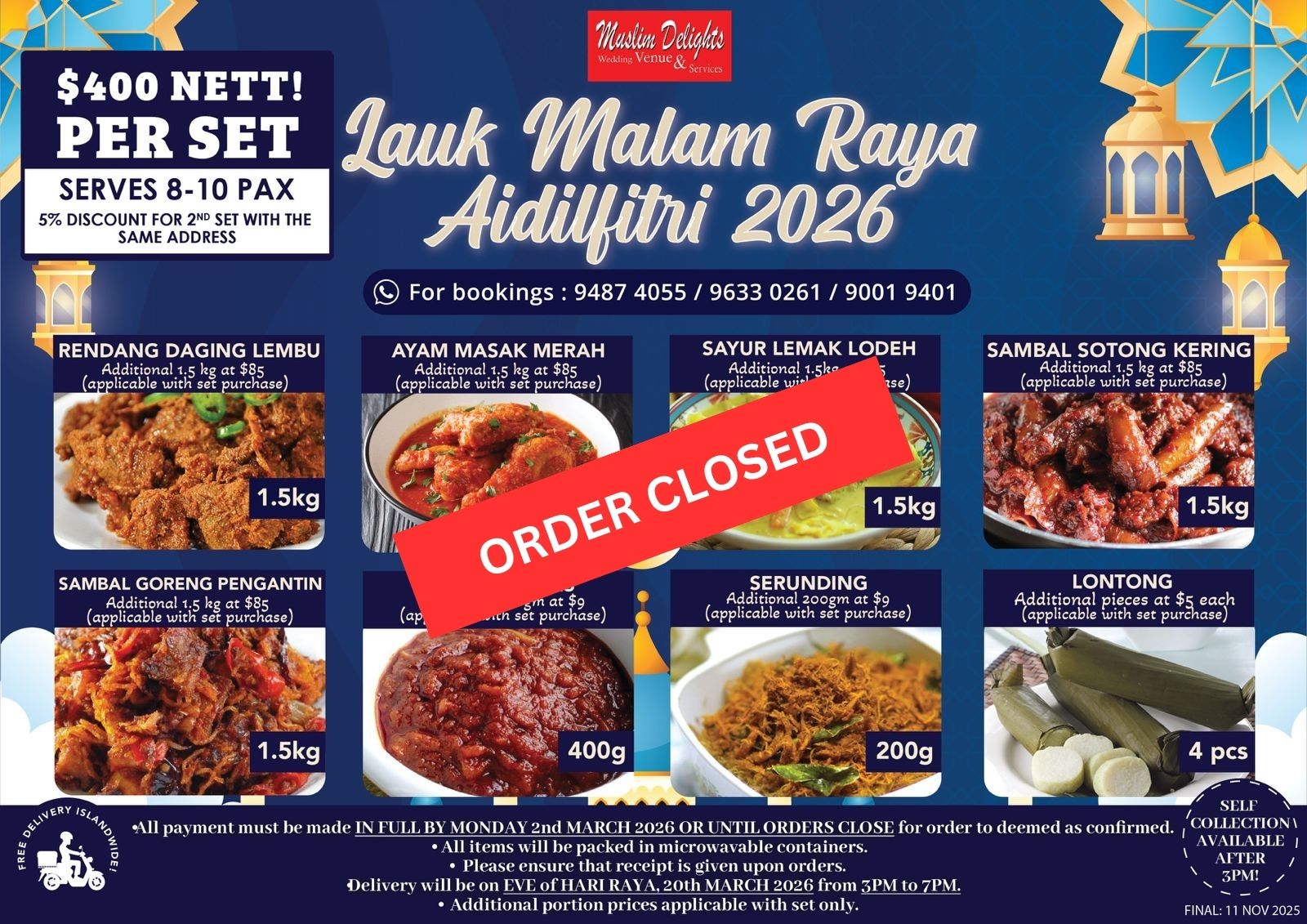 Delivery will be on EVE of HARI RAYA, 20th March 2026 from 3:00 PM to 7:00 PM